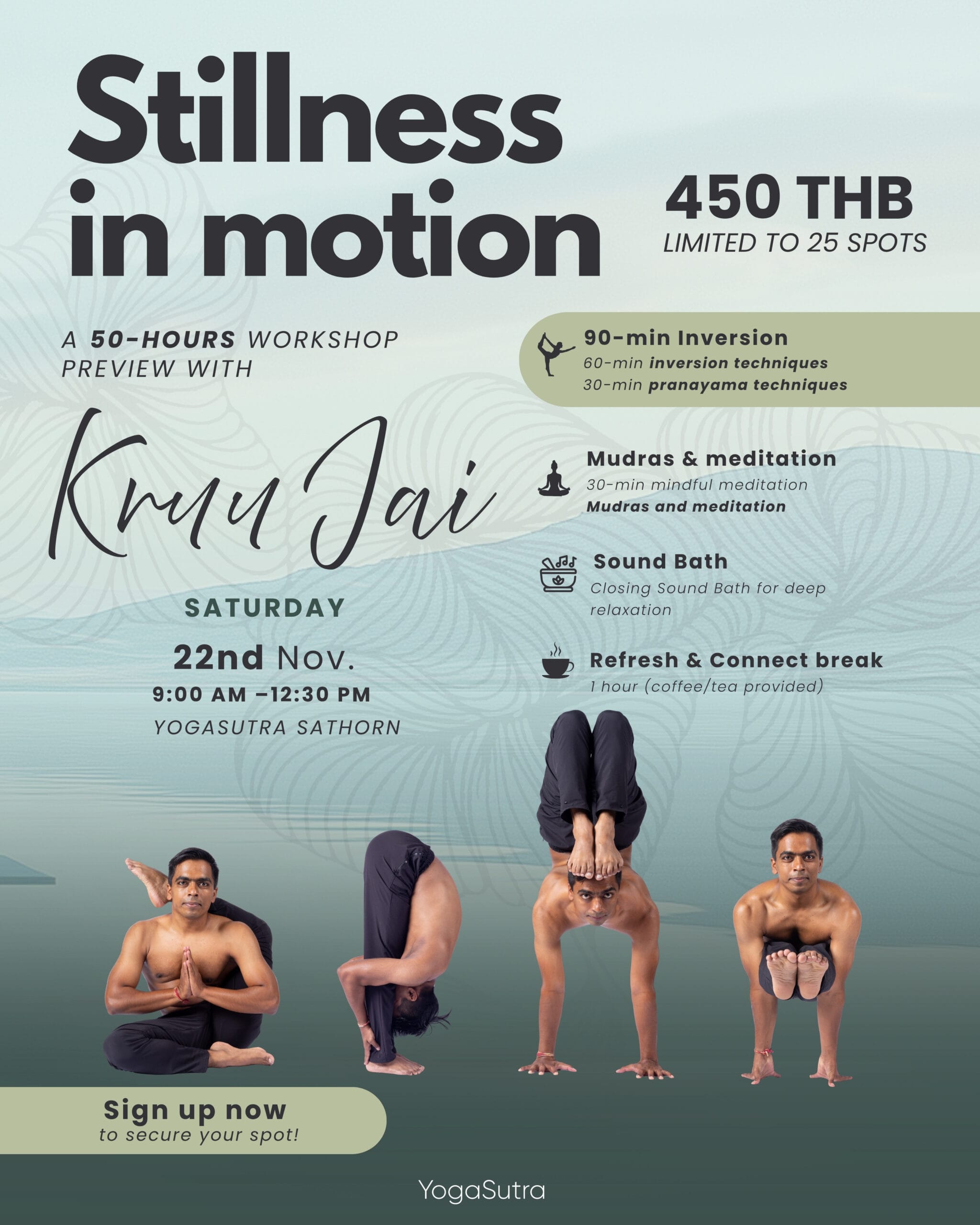 Join Kru Jai for Stillness in Motion, a half-day immersion class that previews his upcoming 50-hour Asana Workshop (January 2026). This isn’t just another flow, it’s where breath, focus, and inversion meet mindful awareness.
